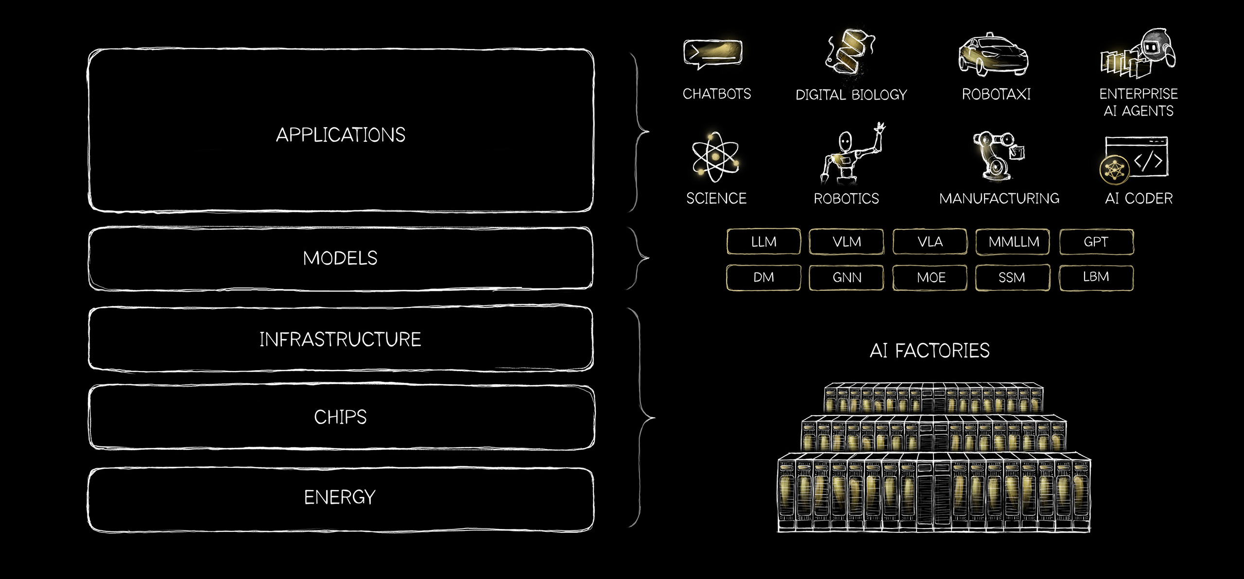 Au-dessus de l’infrastructure se trouvent les modèles. Les modèles d’IA comprennent de nombreux types d’informations : langue, biologie, chimie, physique, finance, médecine et le monde physique lui-même. Les modèles de langage ne constituent qu’une catégorie. Certains des travaux les plus transformateurs concernent l’IA protéique, l’IA chimique, la simulation physique, la robotique et les systèmes autonomes.